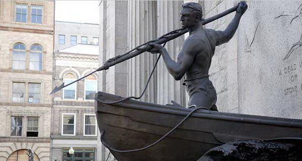 Whatever the day or year, a visit to New Bedford is more fun with a little bit of "Moby-Dick" in mind, and the city is happy to help. Quotations from the novel are displayed around town: one on the Whaleman Statue on Pleasant Street – it depicts a harpooner in the bow of a boat – reads: "A dead whale or a stove boat" – in other words, kill the whale or suffer the consequences of a crushed boat.
